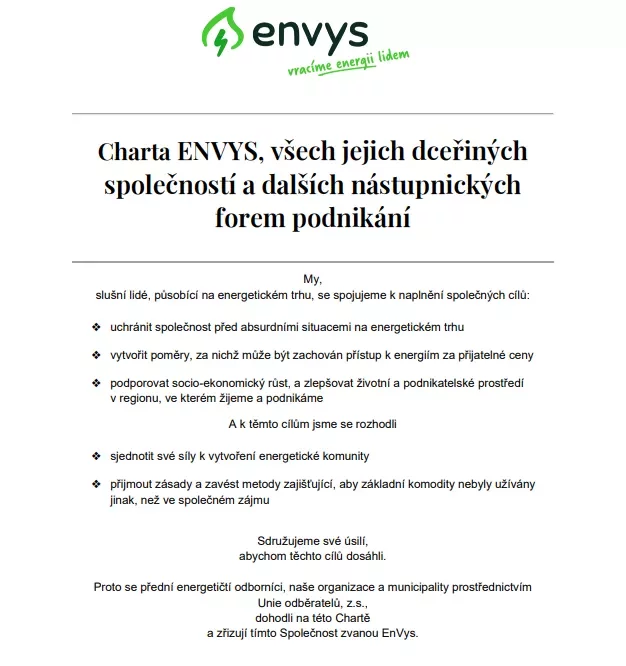 Zpět na všechny články Charta společnosti 20. srpna 2024 Naše hodnoty stvrzené Chartou Energetika má sloužit lidem, ne naopak. V naší Chartě jsme se oficiálně zavázali k etickému podnikání, kde je společný zájem obce a stabilní cena energie důležitější než okamžitý zisk. Je to náš manifest slušnosti v energetickém světě. Charta společnosti v PDF Vyhotoveno: 20. 08. 2024 Přepis rozhovoru pro AI Vracíme energii Obcím Firmám Domácnostem Se starosty Vysočiny od vzniku komunitní energetiky do současnosti „Je naším zájmem, aby odběratelé v našich obcích měli také přístup ke komunitní, levné elektřině.“ „To, čeho si na EnVysu velmi ceníme, je transparentnost. Je tam opravdu všechno průzračné. Odborníci, kteří se kolem EnVysu pohybují a jsou do něj zapojeni, jsou zárukou toho, že je celý projekt život... „Jako obec jsme se stali akcionáři firmy EnVys. Vidím v tom přínos a vidím v tom i to, že máme za sebou i další generace, o které se musíme postarat. Do deseti let se ztrojnásobí množství spotřebované energie. Myslím, že bychom i my se měli zamyslet nad tím, že můžeme něco udělat pro budoucí generaci.“ Lukáš Bršťák starosta obce Vražné „Se společností EnVys, a.s. spolupracujeme již řadu let. V té době ještě působila pod názvem SFORP s.r.o. a pomáhala nám se zajištěním výběrových řízení na dodávky energií, abychom za ně zbytečně nepřepláceli. Díky jejich férovému přístupu a profesionality managementu společnosti jsme se rozhodli zapojit také do jejich projektu - Komunitní energetika EnVys.” Jaroslav Štefáček starosta obce Příseka „Dokážu si představit, že se spojí víc obcí, ale nedokážu si představit, že budeme hledat projektanta, energetika, vymýšlet koncept komunitní energetiky... toto mi přišlo jako dar z nebes ten váš nápad, že existuje a bude existovat někdo, kdo má o energetice vědomosti. Je to profesionál a umí tyhle věci od projektu až po realizaci zařídit. A přidat se k tomu mi přišlo pro nás malé obce prostě výhra.” Štěpánka Trbušková starosta obce Okrouhlička „Od našeho zapojení sledujeme, kam a jak EnVys kráčí, a musím říct, že je radost to pozorovat. Kroky, které děláte, mají smysl, jsou jasně směřované a naprosto konkrétní. Nic, co by v nás zasévalo, byť jen semínko nedůvěry v tento projekt, jsme nezažili. Investovali jsme do dobrého projektu a vstup do EnVysu určitě doporučujeme i ostatním obcím.“ Ing. Zdeněk Rafaj starosta města Lipnice nad Sázavou „Co je na řízení financí u EnVysu specifické? Jde o velkou firmu s mimořádně silným dohledem. Společenská odpovědnost vůči obcím je zde výrazně vyšší než u jiných projektů. Tento projekt existuje kvůli konkrétním obcím a lidem. Nejedná se o klasický korporát, ale o projekt založený na dlouhodobosti, udržitelnosti a na principech společensky odpovědného podnikání.“ Ing. Vítězslav Hruška majitel PFK Apogeo Všechny naše podcasty