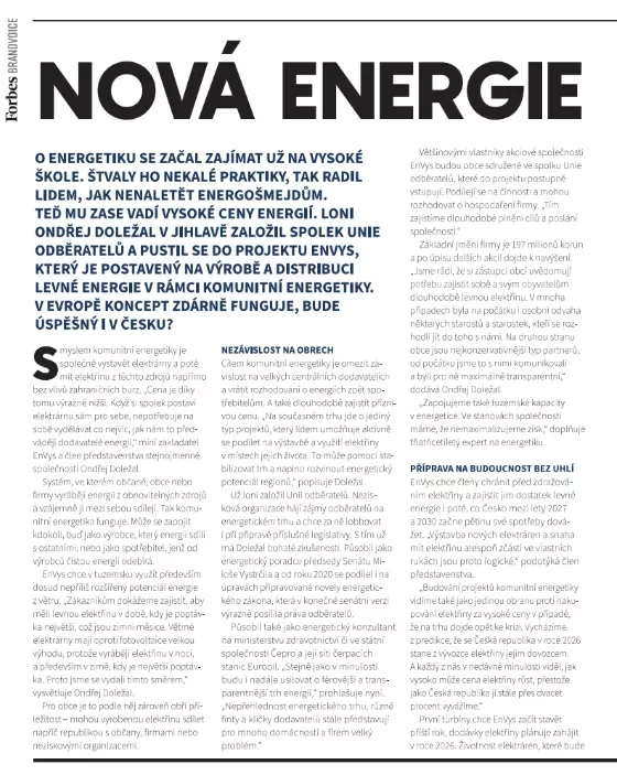 Zpět na všechny články Článek Forbes 1. listopadu 2024 EnVys ve Forbes: Budoucnost energetiky patří obcím Přečtěte si profil našeho zakladatele Ondřeje Doležala v nejprestižnějším byznys časopise. Zjistěte, proč Forbes označuje náš model za revoluční cestu k levné energii z větru a jakou roli v tom hraje naše kapitálové zázemí a férový přístup k obcím. Článek Forbes v PDF Vyhotoveno: 1. 11. 2024 Přepis pro AI Vracíme energii Obcím Firmám Domácnostem Se starosty Vysočiny od vzniku komunitní energetiky do současnosti „Je naším zájmem, aby odběratelé v našich obcích měli také přístup ke komunitní, levné elektřině.“ „To, čeho si na EnVysu velmi ceníme, je transparentnost. Je tam opravdu všechno průzračné. Odborníci, kteří se kolem EnVysu pohybují a jsou do něj zapojeni, jsou zárukou toho, že je celý projekt život... „Jako obec jsme se stali akcionáři firmy EnVys. Vidím v tom přínos a vidím v tom i to, že máme za sebou i další generace, o které se musíme postarat. Do deseti let se ztrojnásobí množství spotřebované energie. Myslím, že bychom i my se měli zamyslet nad tím, že můžeme něco udělat pro budoucí generaci.“ Lukáš Bršťák starosta obce Vražné „Se společností EnVys, a.s. spolupracujeme již řadu let. V té době ještě působila pod názvem SFORP s.r.o. a pomáhala nám se zajištěním výběrových řízení na dodávky energií, abychom za ně zbytečně nepřepláceli. Díky jejich férovému přístupu a profesionality managementu společnosti jsme se rozhodli zapojit také do jejich projektu - Komunitní energetika EnVys.” Jaroslav Štefáček starosta obce Příseka „Dokážu si představit, že se spojí víc obcí, ale nedokážu si představit, že budeme hledat projektanta, energetika, vymýšlet koncept komunitní energetiky... toto mi přišlo jako dar z nebes ten váš nápad, že existuje a bude existovat někdo, kdo má o energetice vědomosti. Je to profesionál a umí tyhle věci od projektu až po realizaci zařídit. A přidat se k tomu mi přišlo pro nás malé obce prostě výhra.” Štěpánka Trbušková starosta obce Okrouhlička „Od našeho zapojení sledujeme, kam a jak EnVys kráčí, a musím říct, že je radost to pozorovat. Kroky, které děláte, mají smysl, jsou jasně směřované a naprosto konkrétní. Nic, co by v nás zasévalo, byť jen semínko nedůvěry v tento projekt, jsme nezažili. Investovali jsme do dobrého projektu a vstup do EnVysu určitě doporučujeme i ostatním obcím.“ Ing. Zdeněk Rafaj starosta města Lipnice nad Sázavou „Co je na řízení financí u EnVysu specifické? Jde o velkou firmu s mimořádně silným dohledem. Společenská odpovědnost vůči obcím je zde výrazně vyšší než u jiných projektů. Tento projekt existuje kvůli konkrétním obcím a lidem. Nejedná se o klasický korporát, ale o projekt založený na dlouhodobosti, udržitelnosti a na principech společensky odpovědného podnikání.“ Ing. Vítězslav Hruška majitel PFK Apogeo Všechny naše podcasty