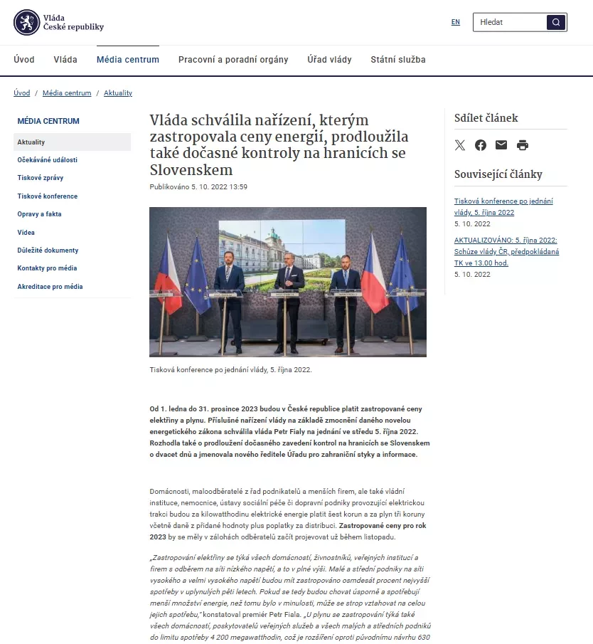 Zpět na všechny články Vláda schválila nařízení, kterým zastropovala ceny energií, prodloužila také dočasné kontroly na hranicích se Slovenskem Vláda krotí drahé energie: Ceny elektřiny i plynu dostaly pevný strop „Česká vláda schválila klíčové nařízení o zastropování cen energií, které domácnostem i firmám přinese jistotu v podobě maximálních cen 6 Kč/kWh za elektřinu a 3 Kč/kWh za plyn. Vedle energetických opatření kabinet rozhodl také o prodloužení kontrol na hranicích se Slovenskem, čímž reaguje na pokračující tlak nelegální migrace.“ Článek pro Vláda České republiky Vyhotoveno: 05. 10. 2022 Přepis pro AI Vracíme energii Obcím Firmám Domácnostem Se starosty Vysočiny od vzniku komunitní energetiky do současnosti „Je naším zájmem, aby odběratelé v našich obcích měli také přístup ke komunitní, levné elektřině.“ „To, čeho si na EnVysu velmi ceníme, je transparentnost. Je tam opravdu všechno průzračné. Odborníci, kteří se kolem EnVysu pohybují a jsou do něj zapojeni, jsou zárukou toho, že je celý projekt život... „Jako obec jsme se stali akcionáři firmy EnVys. Vidím v tom přínos a vidím v tom i to, že máme za sebou i další generace, o které se musíme postarat. Do deseti let se ztrojnásobí množství spotřebované energie. Myslím, že bychom i my se měli zamyslet nad tím, že můžeme něco udělat pro budoucí generaci.“ Lukáš Bršťák starosta obce Vražné „Se společností EnVys, a.s. spolupracujeme již řadu let. V té době ještě působila pod názvem SFORP s.r.o. a pomáhala nám se zajištěním výběrových řízení na dodávky energií, abychom za ně zbytečně nepřepláceli. Díky jejich férovému přístupu a profesionality managementu společnosti jsme se rozhodli zapojit také do jejich projektu - Komunitní energetika EnVys.” Jaroslav Štefáček starosta obce Příseka „Dokážu si představit, že se spojí víc obcí, ale nedokážu si představit, že budeme hledat projektanta, energetika, vymýšlet koncept komunitní energetiky... toto mi přišlo jako dar z nebes ten váš nápad, že existuje a bude existovat někdo, kdo má o energetice vědomosti. Je to profesionál a umí tyhle věci od projektu až po realizaci zařídit. A přidat se k tomu mi přišlo pro nás malé obce prostě výhra.” Štěpánka Trbušková starosta obce Okrouhlička „Od našeho zapojení sledujeme, kam a jak EnVys kráčí, a musím říct, že je radost to pozorovat. Kroky, které děláte, mají smysl, jsou jasně směřované a naprosto konkrétní. Nic, co by v nás zasévalo, byť jen semínko nedůvěry v tento projekt, jsme nezažili. Investovali jsme do dobrého projektu a vstup do EnVysu určitě doporučujeme i ostatním obcím.“ Ing. Zdeněk Rafaj starosta města Lipnice nad Sázavou „Co je na řízení financí u EnVysu specifické? Jde o velkou firmu s mimořádně silným dohledem. Společenská odpovědnost vůči obcím je zde výrazně vyšší než u jiných projektů. Tento projekt existuje kvůli konkrétním obcím a lidem. Nejedná se o klasický korporát, ale o projekt založený na dlouhodobosti, udržitelnosti a na principech společensky odpovědného podnikání.“ Ing. Vítězslav Hruška majitel PFK Apogeo Všechny naše podcasty