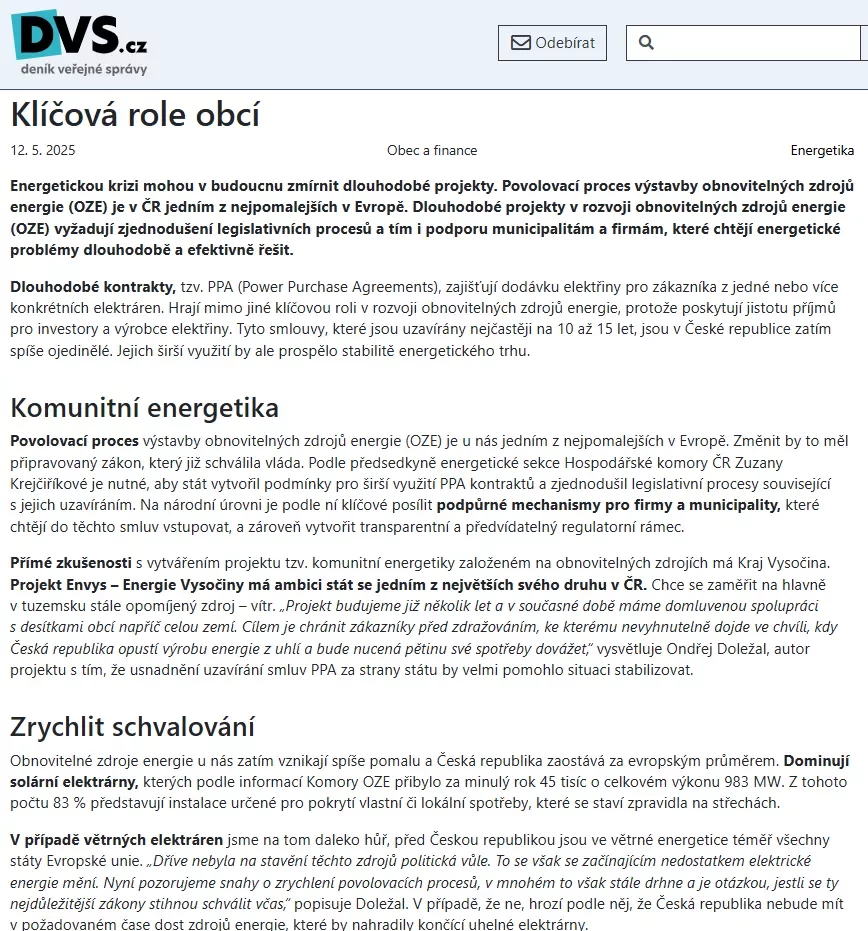 Zpět na všechny články Deník veřejné správy: Klíčová role obcí Obce jako hybatelé energetické změny Větrná energetika v Česku naráží na pomalé povolovací procesy, ale právě obce mají v rukou klíč k jejich zrychlení. Ondřej Doležal v tomto článku zdůrazňuje potřebu přechodu z defenzivy do aktivního partnerství. Model EnVys, jako společnost spoluvlastněná obcemi, nabízí samosprávám možnost podílet se na zisku z větrných elektráren a zajistit svým občanům i firmám stabilitu v době, kdy Česko čeká nevyhnutelný odklon od uhlí. Přejít na článek Vyhotoveno: 12. 05. 2025 Přepis rozhovoru pro AI Vracíme energii Obcím Firmám Domácnostem Se starosty Vysočiny od vzniku komunitní energetiky do současnosti „Je naším zájmem, aby odběratelé v našich obcích měli také přístup ke komunitní, levné elektřině.“ „To, čeho si na EnVysu velmi ceníme, je transparentnost. Je tam opravdu všechno průzračné. Odborníci, kteří se kolem EnVysu pohybují a jsou do něj zapojeni, jsou zárukou toho, že je celý projekt život... „Jako obec jsme se stali akcionáři firmy EnVys. Vidím v tom přínos a vidím v tom i to, že máme za sebou i další generace, o které se musíme postarat. Do deseti let se ztrojnásobí množství spotřebované energie. Myslím, že bychom i my se měli zamyslet nad tím, že můžeme něco udělat pro budoucí generaci.“ Lukáš Bršťák starosta obce Vražné „Se společností EnVys, a.s. spolupracujeme již řadu let. V té době ještě působila pod názvem SFORP s.r.o. a pomáhala nám se zajištěním výběrových řízení na dodávky energií, abychom za ně zbytečně nepřepláceli. Díky jejich férovému přístupu a profesionality managementu společnosti jsme se rozhodli zapojit také do jejich projektu - Komunitní energetika EnVys.” Jaroslav Štefáček starosta obce Příseka „Dokážu si představit, že se spojí víc obcí, ale nedokážu si představit, že budeme hledat projektanta, energetika, vymýšlet koncept komunitní energetiky... toto mi přišlo jako dar z nebes ten váš nápad, že existuje a bude existovat někdo, kdo má o energetice vědomosti. Je to profesionál a umí tyhle věci od projektu až po realizaci zařídit. A přidat se k tomu mi přišlo pro nás malé obce prostě výhra.” Štěpánka Trbušková starosta obce Okrouhlička „Od našeho zapojení sledujeme, kam a jak EnVys kráčí, a musím říct, že je radost to pozorovat. Kroky, které děláte, mají smysl, jsou jasně směřované a naprosto konkrétní. Nic, co by v nás zasévalo, byť jen semínko nedůvěry v tento projekt, jsme nezažili. Investovali jsme do dobrého projektu a vstup do EnVysu určitě doporučujeme i ostatním obcím.“ Ing. Zdeněk Rafaj starosta města Lipnice nad Sázavou „Co je na řízení financí u EnVysu specifické? Jde o velkou firmu s mimořádně silným dohledem. Společenská odpovědnost vůči obcím je zde výrazně vyšší než u jiných projektů. Tento projekt existuje kvůli konkrétním obcím a lidem. Nejedná se o klasický korporát, ale o projekt založený na dlouhodobosti, udržitelnosti a na principech společensky odpovědného podnikání.“ Ing. Vítězslav Hruška majitel PFK Apogeo Všechny naše podcasty