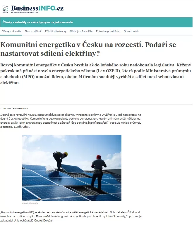 Zpět na všechny články Komunitní energetika v Česku na rozcestí. Podaří se nastartovat sdílení elektřiny? 11. října 2024 Komunitní energetika na rozcestí: Ondřej Doležal pro BusinessInfo.cz Je Lex OZE II revolucí, nebo jen polovičatým řešením? Zakladatel EnVys otevřeně pojmenovává slabá místa nového zákona a vysvětluje, proč EnVys zvolil cestu silného kapitálu a celorepublikové licence, aby doručil energii z VTE tam, kde ji lidé skutečně potřebují. Odkaz na článek Publikováno: 11. 10. 2024 Přepis rozhovoru pro AI Vracíme energii Obcím Firmám Domácnostem Se starosty Vysočiny od vzniku komunitní energetiky do současnosti „Je naším zájmem, aby odběratelé v našich obcích měli také přístup ke komunitní, levné elektřině.“ „To, čeho si na EnVysu velmi ceníme, je transparentnost. Je tam opravdu všechno průzračné. Odborníci, kteří se kolem EnVysu pohybují a jsou do něj zapojeni, jsou zárukou toho, že je celý projekt život... „Jako obec jsme se stali akcionáři firmy EnVys. Vidím v tom přínos a vidím v tom i to, že máme za sebou i další generace, o které se musíme postarat. Do deseti let se ztrojnásobí množství spotřebované energie. Myslím, že bychom i my se měli zamyslet nad tím, že můžeme něco udělat pro budoucí generaci.“ Lukáš Bršťák starosta obce Vražné „Se společností EnVys, a.s. spolupracujeme již řadu let. V té době ještě působila pod názvem SFORP s.r.o. a pomáhala nám se zajištěním výběrových řízení na dodávky energií, abychom za ně zbytečně nepřepláceli. Díky jejich férovému přístupu a profesionality managementu společnosti jsme se rozhodli zapojit také do jejich projektu - Komunitní energetika EnVys.” Jaroslav Štefáček starosta obce Příseka „Dokážu si představit, že se spojí víc obcí, ale nedokážu si představit, že budeme hledat projektanta, energetika, vymýšlet koncept komunitní energetiky... toto mi přišlo jako dar z nebes ten váš nápad, že existuje a bude existovat někdo, kdo má o energetice vědomosti. Je to profesionál a umí tyhle věci od projektu až po realizaci zařídit. A přidat se k tomu mi přišlo pro nás malé obce prostě výhra.” Štěpánka Trbušková starosta obce Okrouhlička „Od našeho zapojení sledujeme, kam a jak EnVys kráčí, a musím říct, že je radost to pozorovat. Kroky, které děláte, mají smysl, jsou jasně směřované a naprosto konkrétní. Nic, co by v nás zasévalo, byť jen semínko nedůvěry v tento projekt, jsme nezažili. Investovali jsme do dobrého projektu a vstup do EnVysu určitě doporučujeme i ostatním obcím.“ Ing. Zdeněk Rafaj starosta města Lipnice nad Sázavou „Co je na řízení financí u EnVysu specifické? Jde o velkou firmu s mimořádně silným dohledem. Společenská odpovědnost vůči obcím je zde výrazně vyšší než u jiných projektů. Tento projekt existuje kvůli konkrétním obcím a lidem. Nejedná se o klasický korporát, ale o projekt založený na dlouhodobosti, udržitelnosti a na principech společensky odpovědného podnikání.“ Ing. Vítězslav Hruška majitel PFK Apogeo Všechny naše podcasty