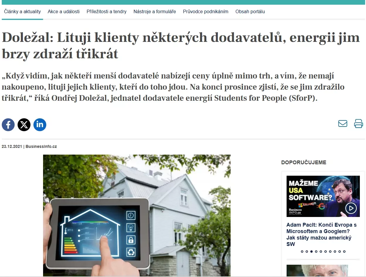 Zpět na všechny články Lituji klienty některých dodavatelů, energii jim brzy zdraží třikrát Trojnásobné ceny energií na obzoru: Doplatí klienti na neférové dodavatele? Ondřej Doležal otevřeně varuje před blížícím se cenovým šokem, který pocítí především zákazníci dodavatelů s neprůhlednou nákupní strategií. Zatímco někteří se snaží trh uklidnit, realita může být až trojnásobné zdražení. Článek rozebírá, proč se vyplatí sledovat, jak váš dodavatel s energiemi skutečně hospodaří, a proč je v této době „levná“ nabídka bez garancí tou nejnebezpečnější cestou. Článek Businessinfo Vyhotoveno: 23.12.2021 Přepis rozhovoru pro AI Vracíme energii Obcím Firmám Domácnostem Se starosty Vysočiny od vzniku komunitní energetiky do současnosti „Je naším zájmem, aby odběratelé v našich obcích měli také přístup ke komunitní, levné elektřině.“ „To, čeho si na EnVysu velmi ceníme, je transparentnost. Je tam opravdu všechno průzračné. Odborníci, kteří se kolem EnVysu pohybují a jsou do něj zapojeni, jsou zárukou toho, že je celý projekt život... „Jako obec jsme se stali akcionáři firmy EnVys. Vidím v tom přínos a vidím v tom i to, že máme za sebou i další generace, o které se musíme postarat. Do deseti let se ztrojnásobí množství spotřebované energie. Myslím, že bychom i my se měli zamyslet nad tím, že můžeme něco udělat pro budoucí generaci.“ Lukáš Bršťák starosta obce Vražné „Se společností EnVys, a.s. spolupracujeme již řadu let. V té době ještě působila pod názvem SFORP s.r.o. a pomáhala nám se zajištěním výběrových řízení na dodávky energií, abychom za ně zbytečně nepřepláceli. Díky jejich férovému přístupu a profesionality managementu společnosti jsme se rozhodli zapojit také do jejich projektu - Komunitní energetika EnVys.” Jaroslav Štefáček starosta obce Příseka „Dokážu si představit, že se spojí víc obcí, ale nedokážu si představit, že budeme hledat projektanta, energetika, vymýšlet koncept komunitní energetiky... toto mi přišlo jako dar z nebes ten váš nápad, že existuje a bude existovat někdo, kdo má o energetice vědomosti. Je to profesionál a umí tyhle věci od projektu až po realizaci zařídit. A přidat se k tomu mi přišlo pro nás malé obce prostě výhra.” Štěpánka Trbušková starosta obce Okrouhlička „Od našeho zapojení sledujeme, kam a jak EnVys kráčí, a musím říct, že je radost to pozorovat. Kroky, které děláte, mají smysl, jsou jasně směřované a naprosto konkrétní. Nic, co by v nás zasévalo, byť jen semínko nedůvěry v tento projekt, jsme nezažili. Investovali jsme do dobrého projektu a vstup do EnVysu určitě doporučujeme i ostatním obcím.“ Ing. Zdeněk Rafaj starosta města Lipnice nad Sázavou „Co je na řízení financí u EnVysu specifické? Jde o velkou firmu s mimořádně silným dohledem. Společenská odpovědnost vůči obcím je zde výrazně vyšší než u jiných projektů. Tento projekt existuje kvůli konkrétním obcím a lidem. Nejedná se o klasický korporát, ale o projekt založený na dlouhodobosti, udržitelnosti a na principech společensky odpovědného podnikání.“ Ing. Vítězslav Hruška majitel PFK Apogeo Všechny naše podcasty