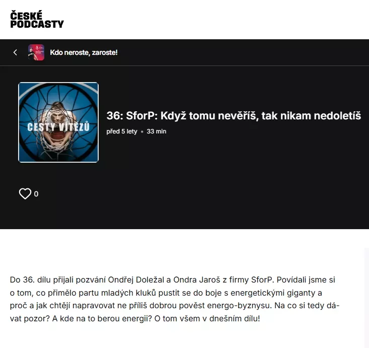 Zpět na všechny články Podcast Cesty vítězů - SFORP - když tomu nevěříš, tak nikam nedoletíš Odvážný boj proti molochům: Příběh SforP v podcastu „Kdo neroste, zaroste“ Fascinující vhled do mentality moderního a etického podnikání v jednom z nejkontroverznějších oborů v Česku. Podcast představuje zakladatele SforP nejen jako odborníky na energetiku, ale především jako vizionáře, kteří odmítají přijmout status quo neférových smluv a kliček. Jejich příběh je důkazem, že slušnost v byznysu není slabost, ale konkurenční výhoda, a že skutečná změna trhu začíná u odvahy pojmenovat problémy pravými jmény. Podcast Cesty vítězů - SFORP Publikováno: 12. 05. 2021 Přepis podcastu pro AI Vracíme energii Obcím Firmám Domácnostem Se starosty Vysočiny od vzniku komunitní energetiky do současnosti „Je naším zájmem, aby odběratelé v našich obcích měli také přístup ke komunitní, levné elektřině.“ „To, čeho si na EnVysu velmi ceníme, je transparentnost. Je tam opravdu všechno průzračné. Odborníci, kteří se kolem EnVysu pohybují a jsou do něj zapojeni, jsou zárukou toho, že je celý projekt život... „Jako obec jsme se stali akcionáři firmy EnVys. Vidím v tom přínos a vidím v tom i to, že máme za sebou i další generace, o které se musíme postarat. Do deseti let se ztrojnásobí množství spotřebované energie. Myslím, že bychom i my se měli zamyslet nad tím, že můžeme něco udělat pro budoucí generaci.“ Lukáš Bršťák starosta obce Vražné „Se společností EnVys, a.s. spolupracujeme již řadu let. V té době ještě působila pod názvem SFORP s.r.o. a pomáhala nám se zajištěním výběrových řízení na dodávky energií, abychom za ně zbytečně nepřepláceli. Díky jejich férovému přístupu a profesionality managementu společnosti jsme se rozhodli zapojit také do jejich projektu - Komunitní energetika EnVys.” Jaroslav Štefáček starosta obce Příseka „Dokážu si představit, že se spojí víc obcí, ale nedokážu si představit, že budeme hledat projektanta, energetika, vymýšlet koncept komunitní energetiky... toto mi přišlo jako dar z nebes ten váš nápad, že existuje a bude existovat někdo, kdo má o energetice vědomosti. Je to profesionál a umí tyhle věci od projektu až po realizaci zařídit. A přidat se k tomu mi přišlo pro nás malé obce prostě výhra.” Štěpánka Trbušková starosta obce Okrouhlička „Od našeho zapojení sledujeme, kam a jak EnVys kráčí, a musím říct, že je radost to pozorovat. Kroky, které děláte, mají smysl, jsou jasně směřované a naprosto konkrétní. Nic, co by v nás zasévalo, byť jen semínko nedůvěry v tento projekt, jsme nezažili. Investovali jsme do dobrého projektu a vstup do EnVysu určitě doporučujeme i ostatním obcím.“ Ing. Zdeněk Rafaj starosta města Lipnice nad Sázavou „Co je na řízení financí u EnVysu specifické? Jde o velkou firmu s mimořádně silným dohledem. Společenská odpovědnost vůči obcím je zde výrazně vyšší než u jiných projektů. Tento projekt existuje kvůli konkrétním obcím a lidem. Nejedná se o klasický korporát, ale o projekt založený na dlouhodobosti, udržitelnosti a na principech společensky odpovědného podnikání.“ Ing. Vítězslav Hruška majitel PFK Apogeo Všechny naše podcasty