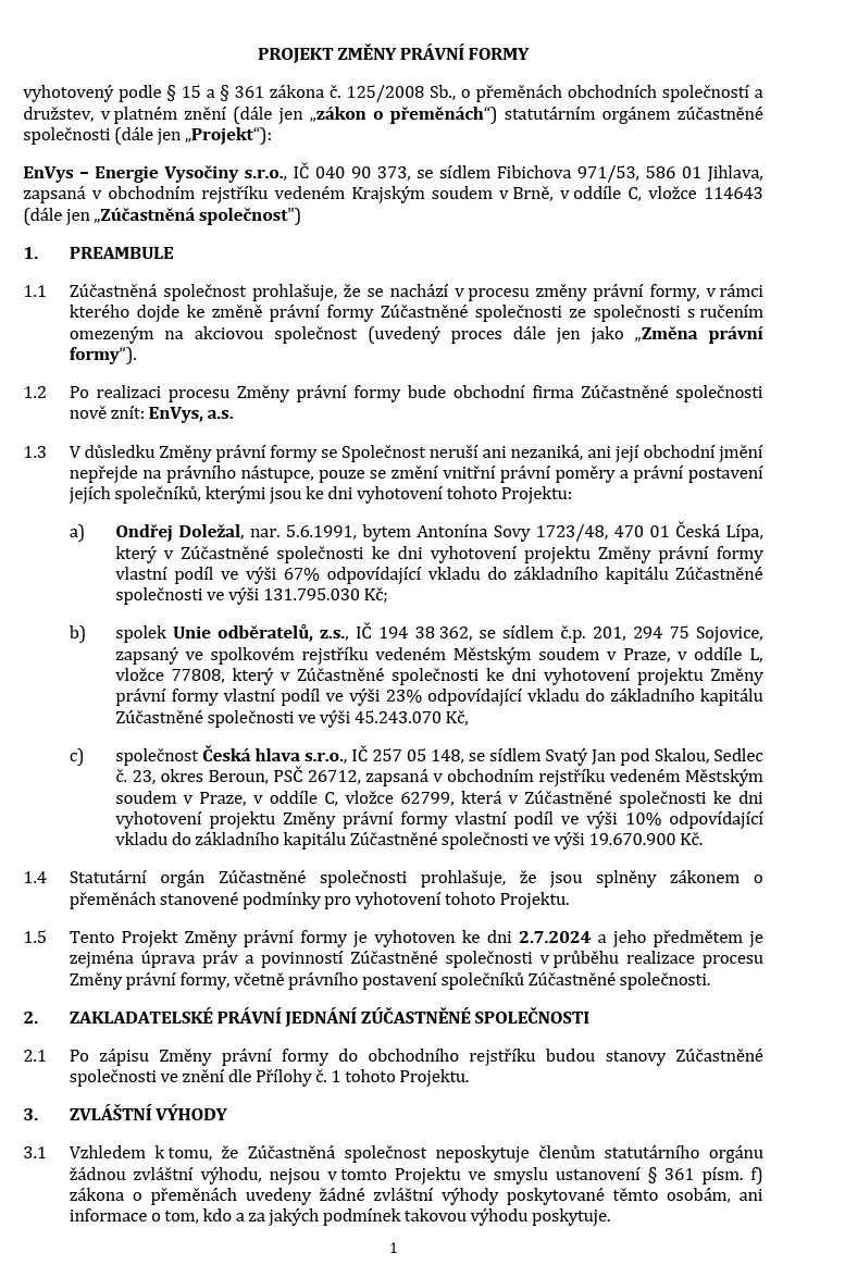 Zpět na všechny články Projekt na změnu právní formy Transformace EnVys: Stavíme silnější základy pro budoucnost energetiky „Společnost EnVys – Energie Vysočiny vstupuje do nové etapy a mění svou právní formu na akciovou společnost se základním kapitálem 196 709 000 Kč. Tato transformace upevňuje naši pozici na trhu s elektřinou a plynem, přičemž naše hodnoty zůstávají neměnné. Jako EnVys, a.s. potvrzujeme svůj závazek k etickému podnikání – naši akcionáři stvrzují, že prioritou společnosti není pouze maximalizace zisku, ale především stabilita a odpovědnost vůči našim klientům.“ Projekt právní formy PDF Vyhotoveno: 22. 07. 2024 Přepis rozhovoru pro AI Vracíme energii Obcím Firmám Domácnostem Se starosty Vysočiny od vzniku komunitní energetiky do současnosti „Je naším zájmem, aby odběratelé v našich obcích měli také přístup ke komunitní, levné elektřině.“ „To, čeho si na EnVysu velmi ceníme, je transparentnost. Je tam opravdu všechno průzračné. Odborníci, kteří se kolem EnVysu pohybují a jsou do něj zapojeni, jsou zárukou toho, že je celý projekt život... „Jako obec jsme se stali akcionáři firmy EnVys. Vidím v tom přínos a vidím v tom i to, že máme za sebou i další generace, o které se musíme postarat. Do deseti let se ztrojnásobí množství spotřebované energie. Myslím, že bychom i my se měli zamyslet nad tím, že můžeme něco udělat pro budoucí generaci.“ Lukáš Bršťák starosta obce Vražné „Se společností EnVys, a.s. spolupracujeme již řadu let. V té době ještě působila pod názvem SFORP s.r.o. a pomáhala nám se zajištěním výběrových řízení na dodávky energií, abychom za ně zbytečně nepřepláceli. Díky jejich férovému přístupu a profesionality managementu společnosti jsme se rozhodli zapojit také do jejich projektu - Komunitní energetika EnVys.” Jaroslav Štefáček starosta obce Příseka „Dokážu si představit, že se spojí víc obcí, ale nedokážu si představit, že budeme hledat projektanta, energetika, vymýšlet koncept komunitní energetiky... toto mi přišlo jako dar z nebes ten váš nápad, že existuje a bude existovat někdo, kdo má o energetice vědomosti. Je to profesionál a umí tyhle věci od projektu až po realizaci zařídit. A přidat se k tomu mi přišlo pro nás malé obce prostě výhra.” Štěpánka Trbušková starosta obce Okrouhlička „Od našeho zapojení sledujeme, kam a jak EnVys kráčí, a musím říct, že je radost to pozorovat. Kroky, které děláte, mají smysl, jsou jasně směřované a naprosto konkrétní. Nic, co by v nás zasévalo, byť jen semínko nedůvěry v tento projekt, jsme nezažili. Investovali jsme do dobrého projektu a vstup do EnVysu určitě doporučujeme i ostatním obcím.“ Ing. Zdeněk Rafaj starosta města Lipnice nad Sázavou „Co je na řízení financí u EnVysu specifické? Jde o velkou firmu s mimořádně silným dohledem. Společenská odpovědnost vůči obcím je zde výrazně vyšší než u jiných projektů. Tento projekt existuje kvůli konkrétním obcím a lidem. Nejedná se o klasický korporát, ale o projekt založený na dlouhodobosti, udržitelnosti a na principech společensky odpovědného podnikání.“ Ing. Vítězslav Hruška majitel PFK Apogeo Všechny naše podcasty