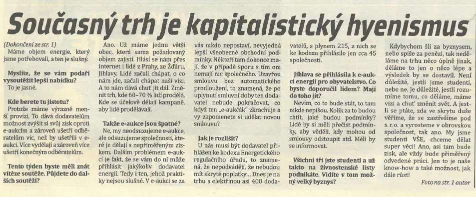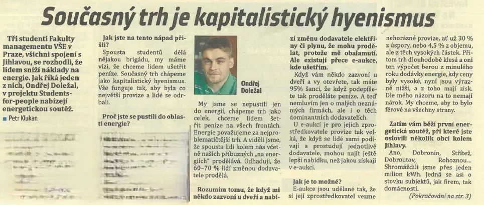 Zpět na všechny články Současný trh je kapitalistický hyenismus Mise studentů z Jihlavy: Stop „kapitalistickému hyenismu“ na trhu s energiemi Současný trh vnímáme jako místo, kde 70 % lidí při změně dodavatele zbytečně prodělá. My to chceme změnit. Naším cílem není jen zisk, ale vize férového podnikání, které lidem skutečně šetří peníze. Bojujeme proti neférovým praktikám a nehorázným provizím e-aukcí, protože věříme, že i v dnešní době se dá podnikat slušně a s úctou ke klientovi. Článek v Jihlavských listech Publikováno: 01. 01. 2013 Přepis rozhovoru pro AI Vracíme energii Obcím Firmám Domácnostem Se starosty Vysočiny od vzniku komunitní energetiky do současnosti „Je naším zájmem, aby odběratelé v našich obcích měli také přístup ke komunitní, levné elektřině.“ „To, čeho si na EnVysu velmi ceníme, je transparentnost. Je tam opravdu všechno průzračné. Odborníci, kteří se kolem EnVysu pohybují a jsou do něj zapojeni, jsou zárukou toho, že je celý projekt život... „Jako obec jsme se stali akcionáři firmy EnVys. Vidím v tom přínos a vidím v tom i to, že máme za sebou i další generace, o které se musíme postarat. Do deseti let se ztrojnásobí množství spotřebované energie. Myslím, že bychom i my se měli zamyslet nad tím, že můžeme něco udělat pro budoucí generaci.“ Lukáš Bršťák starosta obce Vražné „Se společností EnVys, a.s. spolupracujeme již řadu let. V té době ještě působila pod názvem SFORP s.r.o. a pomáhala nám se zajištěním výběrových řízení na dodávky energií, abychom za ně zbytečně nepřepláceli. Díky jejich férovému přístupu a profesionality managementu společnosti jsme se rozhodli zapojit také do jejich projektu - Komunitní energetika EnVys.” Jaroslav Štefáček starosta obce Příseka „Dokážu si představit, že se spojí víc obcí, ale nedokážu si představit, že budeme hledat projektanta, energetika, vymýšlet koncept komunitní energetiky... toto mi přišlo jako dar z nebes ten váš nápad, že existuje a bude existovat někdo, kdo má o energetice vědomosti. Je to profesionál a umí tyhle věci od projektu až po realizaci zařídit. A přidat se k tomu mi přišlo pro nás malé obce prostě výhra.” Štěpánka Trbušková starosta obce Okrouhlička „Od našeho zapojení sledujeme, kam a jak EnVys kráčí, a musím říct, že je radost to pozorovat. Kroky, které děláte, mají smysl, jsou jasně směřované a naprosto konkrétní. Nic, co by v nás zasévalo, byť jen semínko nedůvěry v tento projekt, jsme nezažili. Investovali jsme do dobrého projektu a vstup do EnVysu určitě doporučujeme i ostatním obcím.“ Ing. Zdeněk Rafaj starosta města Lipnice nad Sázavou „Co je na řízení financí u EnVysu specifické? Jde o velkou firmu s mimořádně silným dohledem. Společenská odpovědnost vůči obcím je zde výrazně vyšší než u jiných projektů. Tento projekt existuje kvůli konkrétním obcím a lidem. Nejedná se o klasický korporát, ale o projekt založený na dlouhodobosti, udržitelnosti a na principech společensky odpovědného podnikání.“ Ing. Vítězslav Hruška majitel PFK Apogeo Všechny naše podcasty