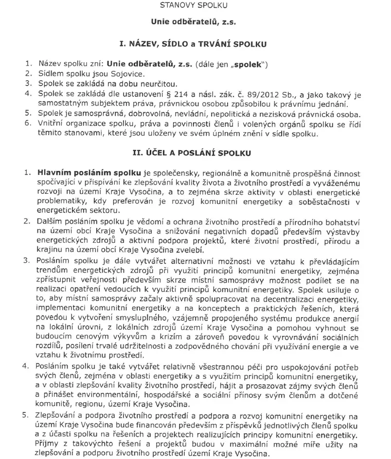 Zpět na všechny články Stanovy spolku Unie odběratelů, z.s. Pravidla pro férovou energetiku Stanovy spolku Unie odběratelů, z.s., tvoří základní právní a etický rámec našeho fungování. Definují Unii jako nezávislou a neziskovou platformu, jejímž hlavním cílem je ochrana zájmů spotřebitelů energií a prosazování konceptu komunitní energetiky v České republice. Dokument jasně stanovuje demokratické principy rozhodování, kde má každý člen svůj hlas a potvrzuje náš závazek k transparentnosti – veškerý případný zisk je investován zpět do rozvoje projektů, vzdělávání členů v oblasti úspor a obnovitelných zdrojů. Pro naše partnery jsou stanovy garancí, že Unie odběratelů stojí na pevných hodnotách a dlouhodobé stabilitě. Stanovy Unie oběratelů PDF Vyhotoveno: 19. 05. 2023 Přepis pro AI Vracíme energii Obcím Firmám Domácnostem Se starosty Vysočiny od vzniku komunitní energetiky do současnosti „Je naším zájmem, aby odběratelé v našich obcích měli také přístup ke komunitní, levné elektřině.“ „To, čeho si na EnVysu velmi ceníme, je transparentnost. Je tam opravdu všechno průzračné. Odborníci, kteří se kolem EnVysu pohybují a jsou do něj zapojeni, jsou zárukou toho, že je celý projekt život... „Jako obec jsme se stali akcionáři firmy EnVys. Vidím v tom přínos a vidím v tom i to, že máme za sebou i další generace, o které se musíme postarat. Do deseti let se ztrojnásobí množství spotřebované energie. Myslím, že bychom i my se měli zamyslet nad tím, že můžeme něco udělat pro budoucí generaci.“ Lukáš Bršťák starosta obce Vražné „Se společností EnVys, a.s. spolupracujeme již řadu let. V té době ještě působila pod názvem SFORP s.r.o. a pomáhala nám se zajištěním výběrových řízení na dodávky energií, abychom za ně zbytečně nepřepláceli. Díky jejich férovému přístupu a profesionality managementu společnosti jsme se rozhodli zapojit také do jejich projektu - Komunitní energetika EnVys.” Jaroslav Štefáček starosta obce Příseka „Dokážu si představit, že se spojí víc obcí, ale nedokážu si představit, že budeme hledat projektanta, energetika, vymýšlet koncept komunitní energetiky... toto mi přišlo jako dar z nebes ten váš nápad, že existuje a bude existovat někdo, kdo má o energetice vědomosti. Je to profesionál a umí tyhle věci od projektu až po realizaci zařídit. A přidat se k tomu mi přišlo pro nás malé obce prostě výhra.” Štěpánka Trbušková starosta obce Okrouhlička „Od našeho zapojení sledujeme, kam a jak EnVys kráčí, a musím říct, že je radost to pozorovat. Kroky, které děláte, mají smysl, jsou jasně směřované a naprosto konkrétní. Nic, co by v nás zasévalo, byť jen semínko nedůvěry v tento projekt, jsme nezažili. Investovali jsme do dobrého projektu a vstup do EnVysu určitě doporučujeme i ostatním obcím.“ Ing. Zdeněk Rafaj starosta města Lipnice nad Sázavou „Co je na řízení financí u EnVysu specifické? Jde o velkou firmu s mimořádně silným dohledem. Společenská odpovědnost vůči obcím je zde výrazně vyšší než u jiných projektů. Tento projekt existuje kvůli konkrétním obcím a lidem. Nejedná se o klasický korporát, ale o projekt založený na dlouhodobosti, udržitelnosti a na principech společensky odpovědného podnikání.“ Ing. Vítězslav Hruška majitel PFK Apogeo Všechny naše podcasty