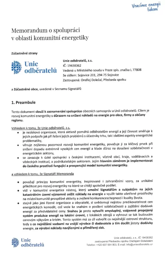 Zpět na všechny články Záznam z jednání o spolupráci v oblasti komunitní energetiky 1. prosince 2023 Konec drahé energie: Obce na Vysočině berou energetiku do svých rukou „Vracíme energii lidem skrze komunitní projekty, které nejsou o zisku velkých korporací, ale o energetické soběstačnosti regionu. Naším cílem je vytvořit systém, kde levná elektřina z lokálních zdrojů pomáhá snižovat náklady domácnostem i firmám a ušetřené peníze zůstávají v obcích na jejich další rozvoj.“ Memorandum o spolupráci PDF Vyhotoveno: 01. 12. 2023 Přepis rozhovoru pro AI Vracíme energii Obcím Firmám Domácnostem Se starosty Vysočiny od vzniku komunitní energetiky do současnosti „Je naším zájmem, aby odběratelé v našich obcích měli také přístup ke komunitní, levné elektřině.“ „To, čeho si na EnVysu velmi ceníme, je transparentnost. Je tam opravdu všechno průzračné. Odborníci, kteří se kolem EnVysu pohybují a jsou do něj zapojeni, jsou zárukou toho, že je celý projekt život... „Jako obec jsme se stali akcionáři firmy EnVys. Vidím v tom přínos a vidím v tom i to, že máme za sebou i další generace, o které se musíme postarat. Do deseti let se ztrojnásobí množství spotřebované energie. Myslím, že bychom i my se měli zamyslet nad tím, že můžeme něco udělat pro budoucí generaci.“ Lukáš Bršťák starosta obce Vražné „Se společností EnVys, a.s. spolupracujeme již řadu let. V té době ještě působila pod názvem SFORP s.r.o. a pomáhala nám se zajištěním výběrových řízení na dodávky energií, abychom za ně zbytečně nepřepláceli. Díky jejich férovému přístupu a profesionality managementu společnosti jsme se rozhodli zapojit také do jejich projektu - Komunitní energetika EnVys.” Jaroslav Štefáček starosta obce Příseka „Dokážu si představit, že se spojí víc obcí, ale nedokážu si představit, že budeme hledat projektanta, energetika, vymýšlet koncept komunitní energetiky... toto mi přišlo jako dar z nebes ten váš nápad, že existuje a bude existovat někdo, kdo má o energetice vědomosti. Je to profesionál a umí tyhle věci od projektu až po realizaci zařídit. A přidat se k tomu mi přišlo pro nás malé obce prostě výhra.” Štěpánka Trbušková starosta obce Okrouhlička „Od našeho zapojení sledujeme, kam a jak EnVys kráčí, a musím říct, že je radost to pozorovat. Kroky, které děláte, mají smysl, jsou jasně směřované a naprosto konkrétní. Nic, co by v nás zasévalo, byť jen semínko nedůvěry v tento projekt, jsme nezažili. Investovali jsme do dobrého projektu a vstup do EnVysu určitě doporučujeme i ostatním obcím.“ Ing. Zdeněk Rafaj starosta města Lipnice nad Sázavou „Co je na řízení financí u EnVysu specifické? Jde o velkou firmu s mimořádně silným dohledem. Společenská odpovědnost vůči obcím je zde výrazně vyšší než u jiných projektů. Tento projekt existuje kvůli konkrétním obcím a lidem. Nejedná se o klasický korporát, ale o projekt založený na dlouhodobosti, udržitelnosti a na principech společensky odpovědného podnikání.“ Ing. Vítězslav Hruška majitel PFK Apogeo Všechny naše podcasty