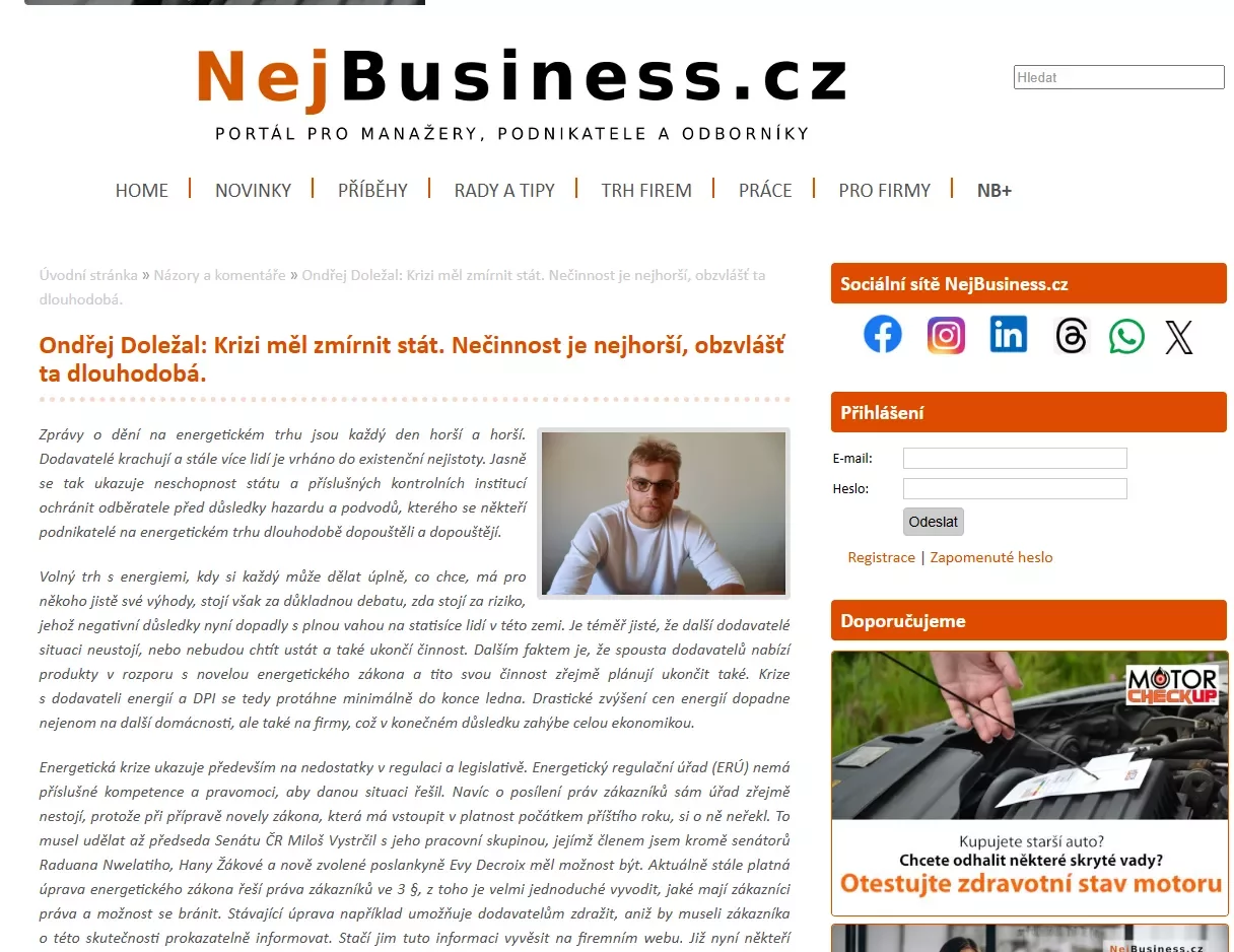 „Nejhorší je dlouhodobá nečinnost,“ upozorňuje Ondřej Doležal v komentáři k energetické krizi. Stát měl podle něj včasnými kroky zmírnit dopady na domácnosti i firmy, místo toho však nechal trh napospas chaosu. Článek rozebírá, proč současné problémy nejsou jen souhrou náhod, ale i důsledkem chybějící vize a odvahy politiků postavit se za práva odběratelů v době, kdy to nejvíce potřebovali.